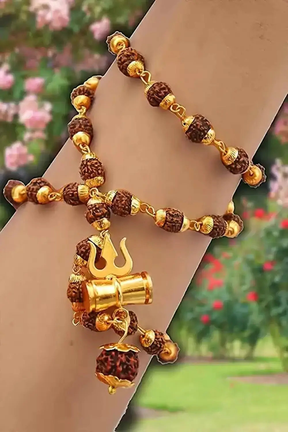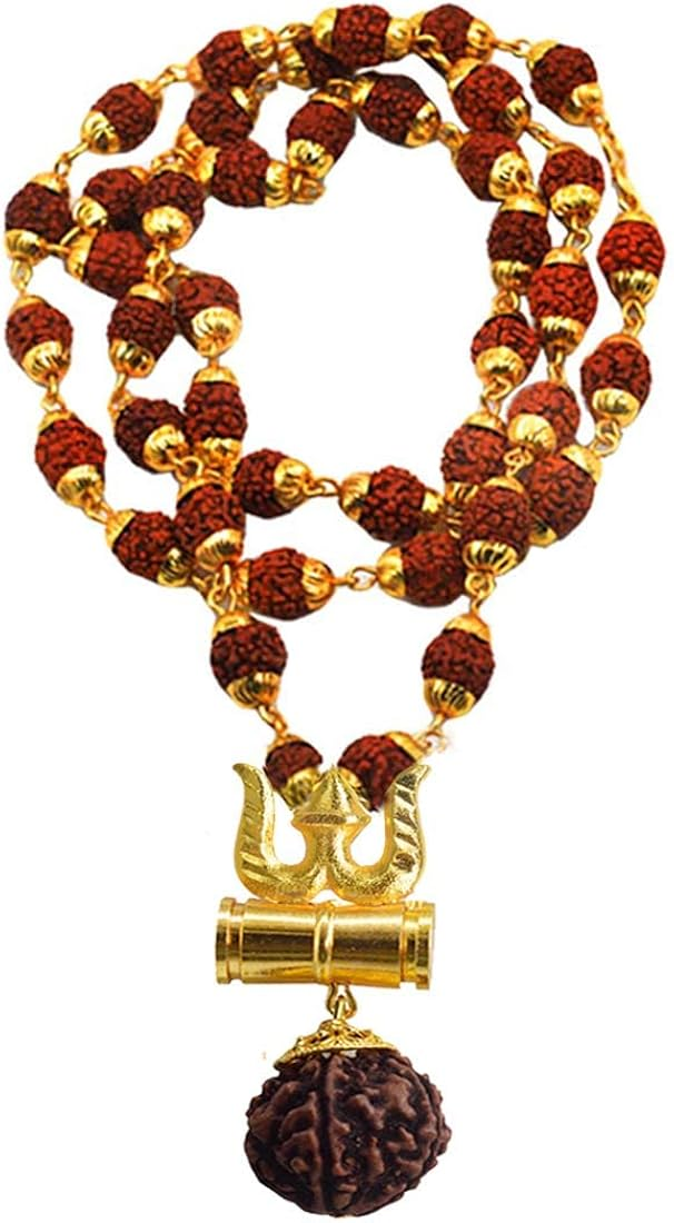 A brown Trishul Damru locket with Rudraksha mala is a traditional Hindu spiritual accessory dedicated to Lord Shiva.